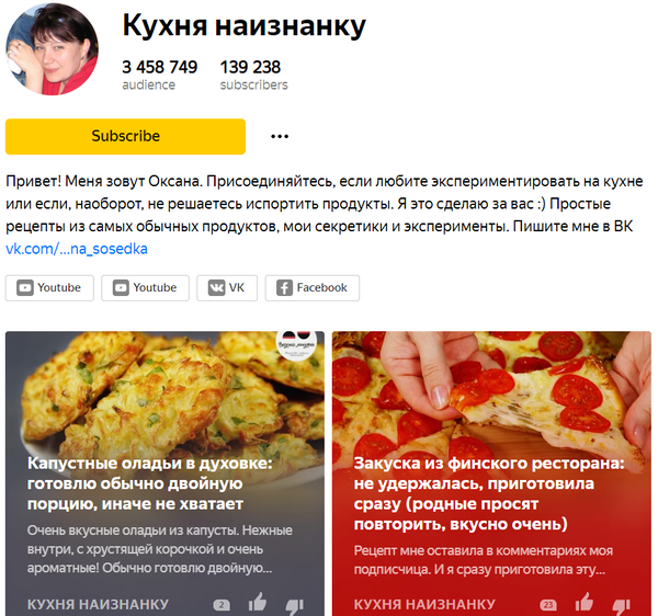 2. Оксана Соседка — простая женщина, которая ведет канал о еде "Кухня наизнанку". На канале уже более 137 тысяч подписчиков. Она просто любит готовить и пишет об этом блог, выкладывая вкусные рецепты блюд.