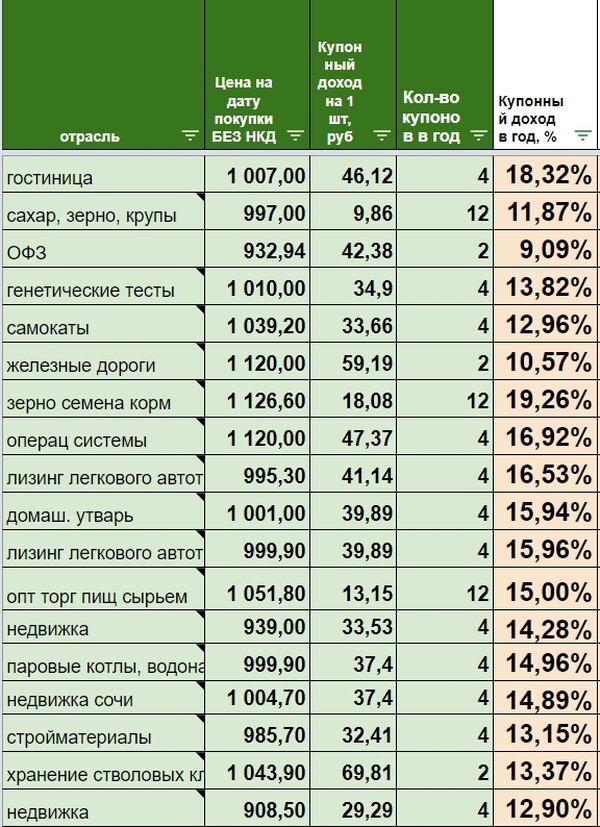 Вот пример моего списка отобранных облигаций