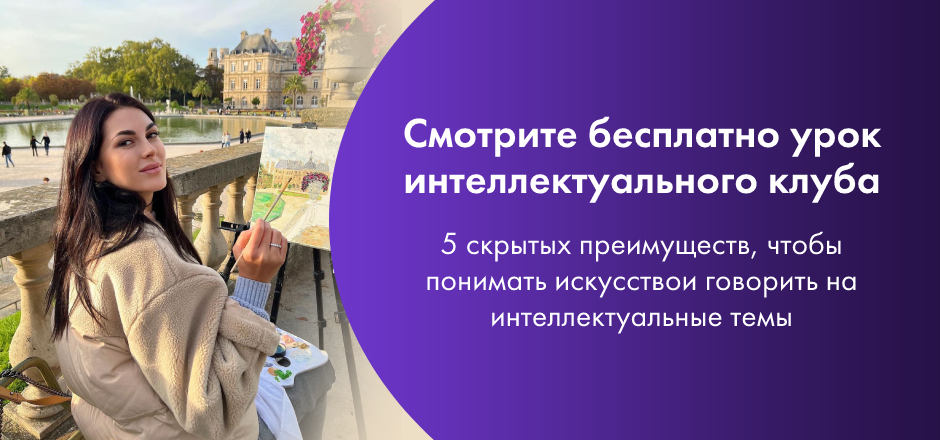 Еще больше о том, что дает искусство и почему важно его изучать, вы можете узнать на бесплатном открытом уроке интеллектуального клуба «5 скрытых преимуществ, чтобы понимать искусство и говорить на интеллектуальные темы уверенно и с интересом».