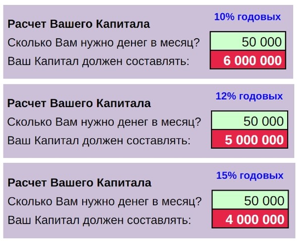 - Какого размера должен быть ваш Капитал, чтобы %% от него давали вам 600'000 рублей в год (50'000 рублей в месяц)